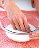 نقع اليدين في وعاء من الحليب كامل الدسم الدافئ لعدة دقائق. حامض اللبنيك في الحليب يساعد على إزالة الخلايا الميتة وتنعيم البشرة ، وتساعد الدهون الطبيعية تجديد الجلد الجاف.